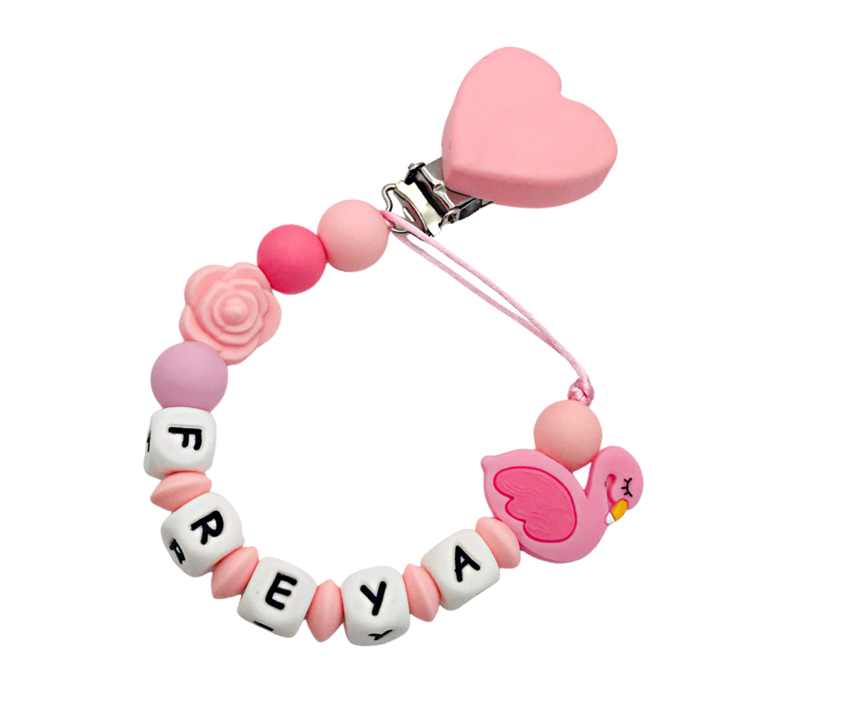 FLUFFY CLOUDS Flamingo Pacifier Clip is a practical accessory for parents and babies. Modern stylish designs that are easy to use and fun to chew on! A safe and hygienic way to prevent the dummy from getting lost or dirty. Our pacifier clips come in a variety of colours, shapes and interesting textures. Carefully handmade in the UK. Suitable from birth.
