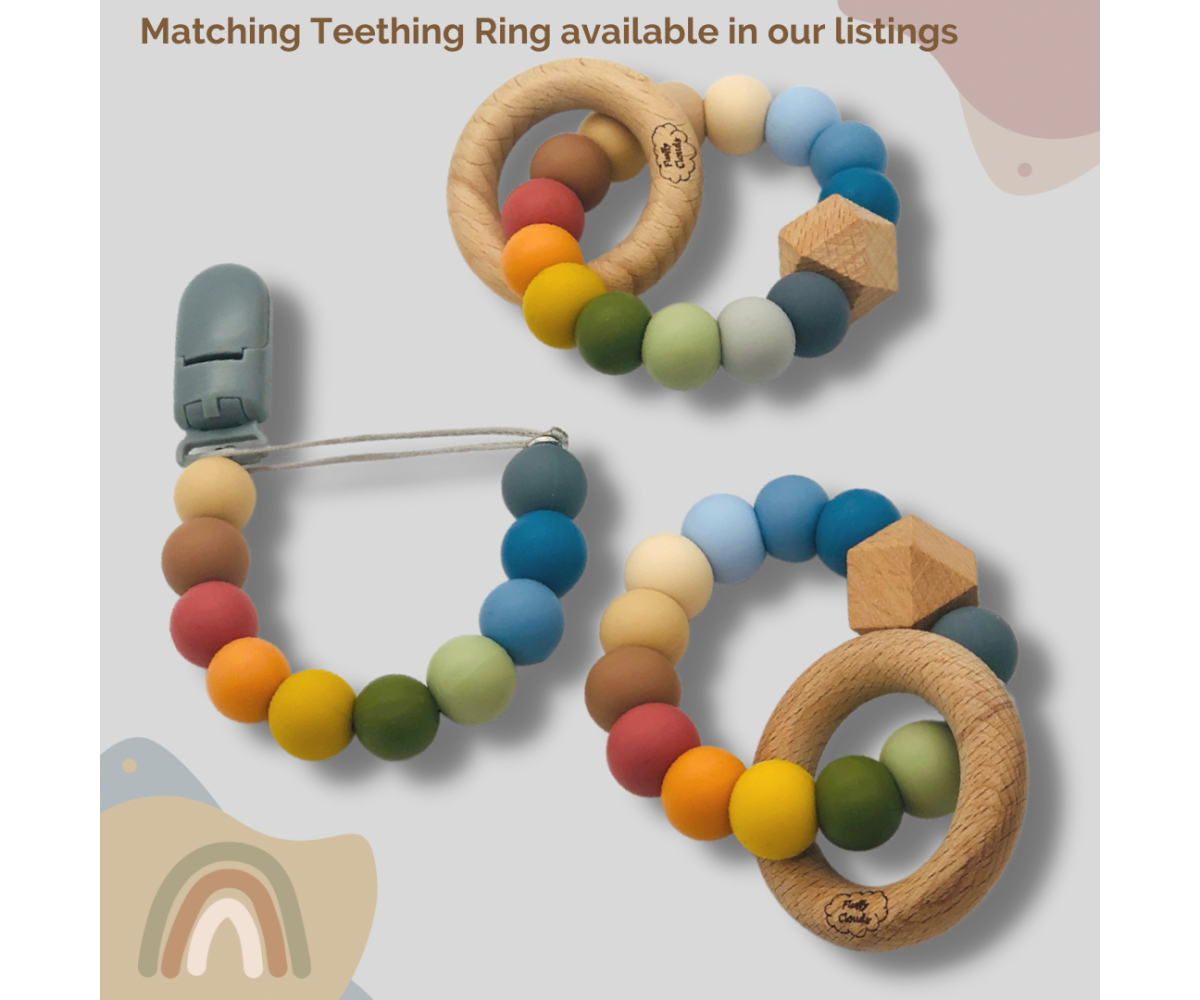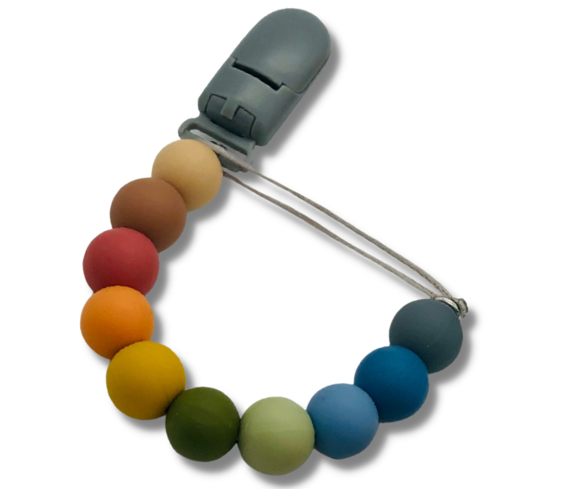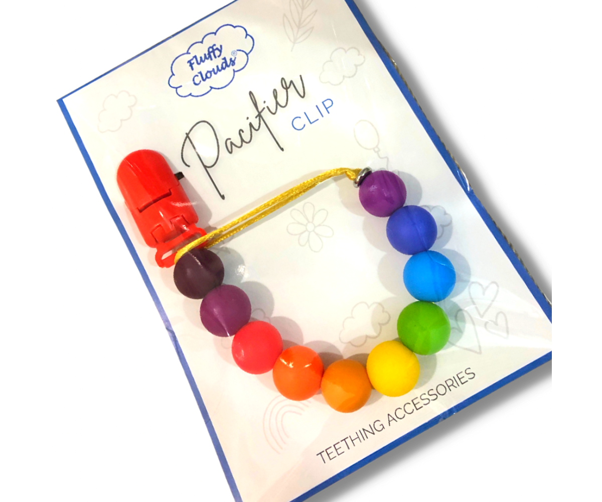 FLUFFY CLOUDS Classic Rainbow Pacifier Clip is a practical accessory for parents and babies. Modern stylish designs that are easy to use and fun to chew on! A safe and hygienic way to prevent the dummy from getting lost or dirty. Our pacifier clips come in a variety of colours, shapes and interesting textures. Carefully handmade in the UK. Suitable from birth.