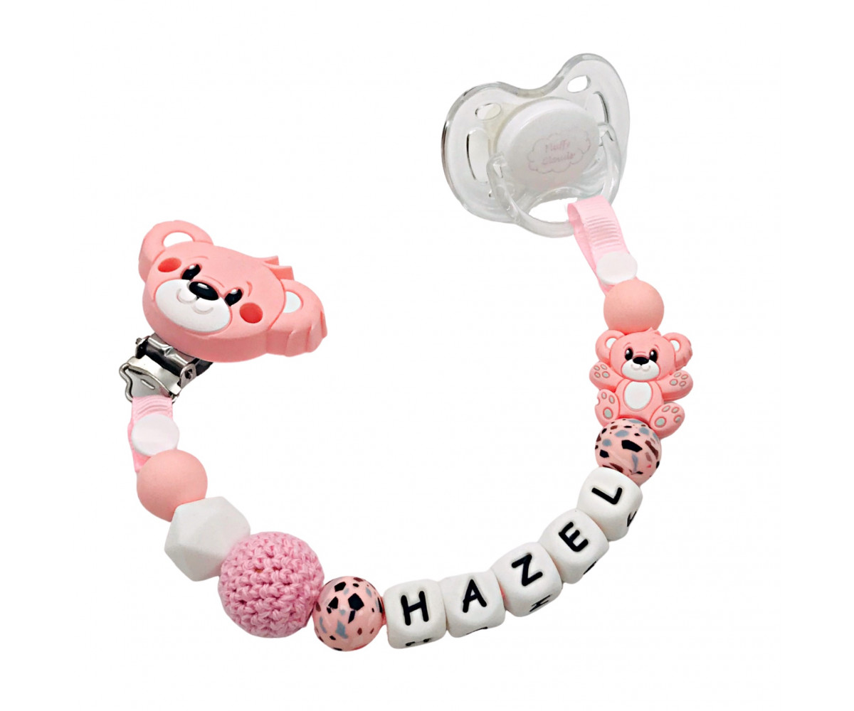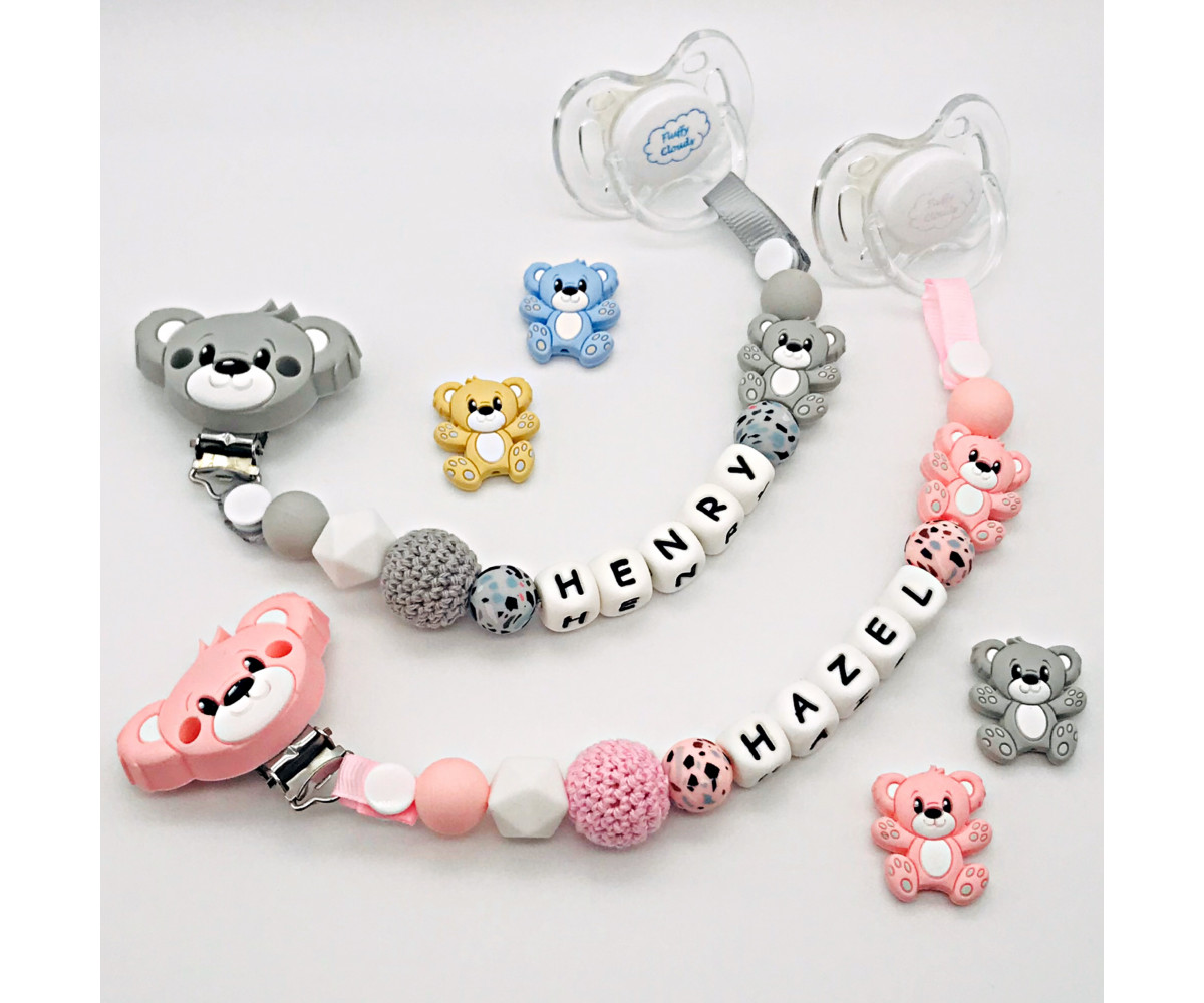 Tags: dummy clip, pacifier holder, soother chain, handmade, personalized, silicone chewable beads, baby name, baby shower gift, new born present, teething accessories