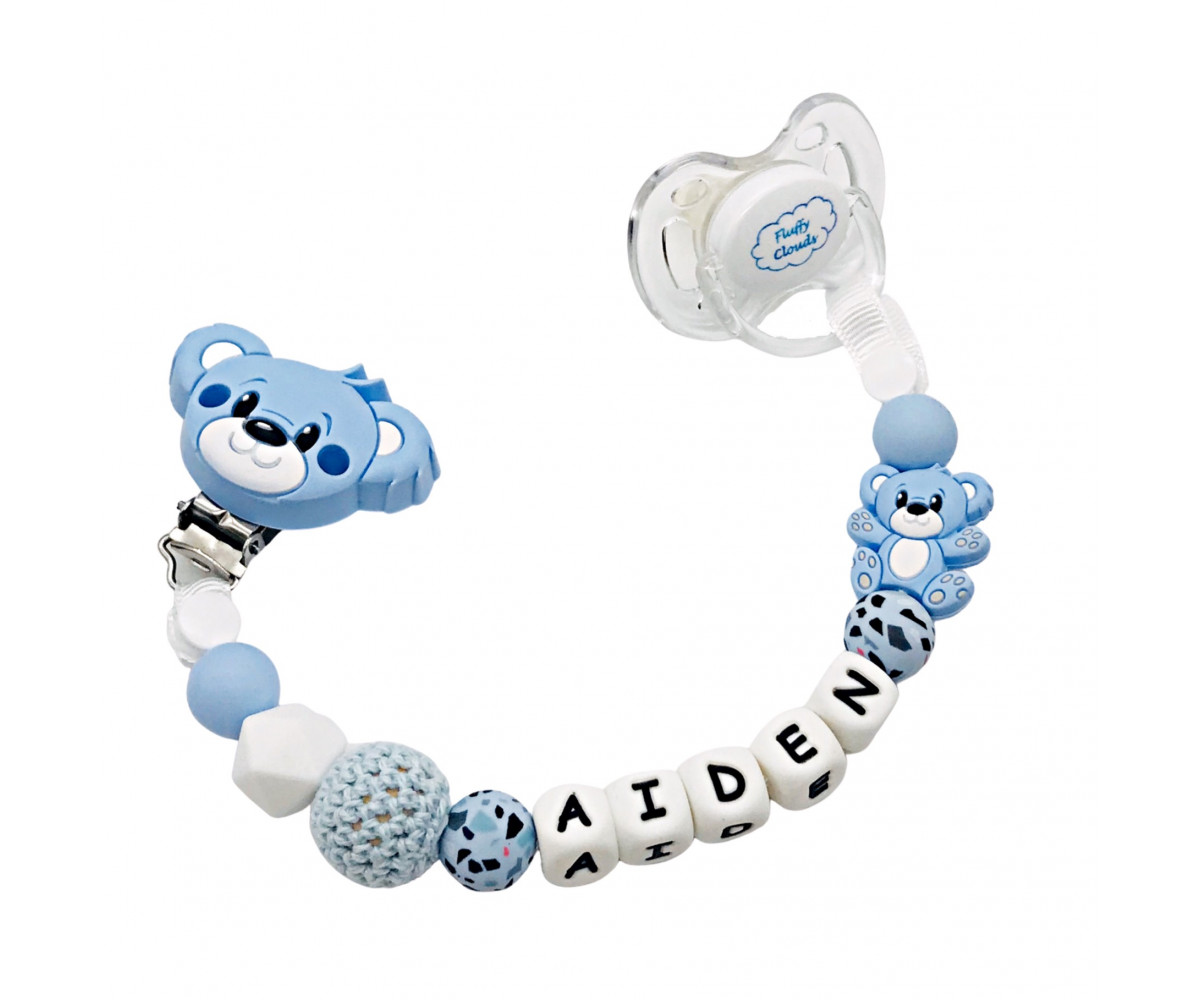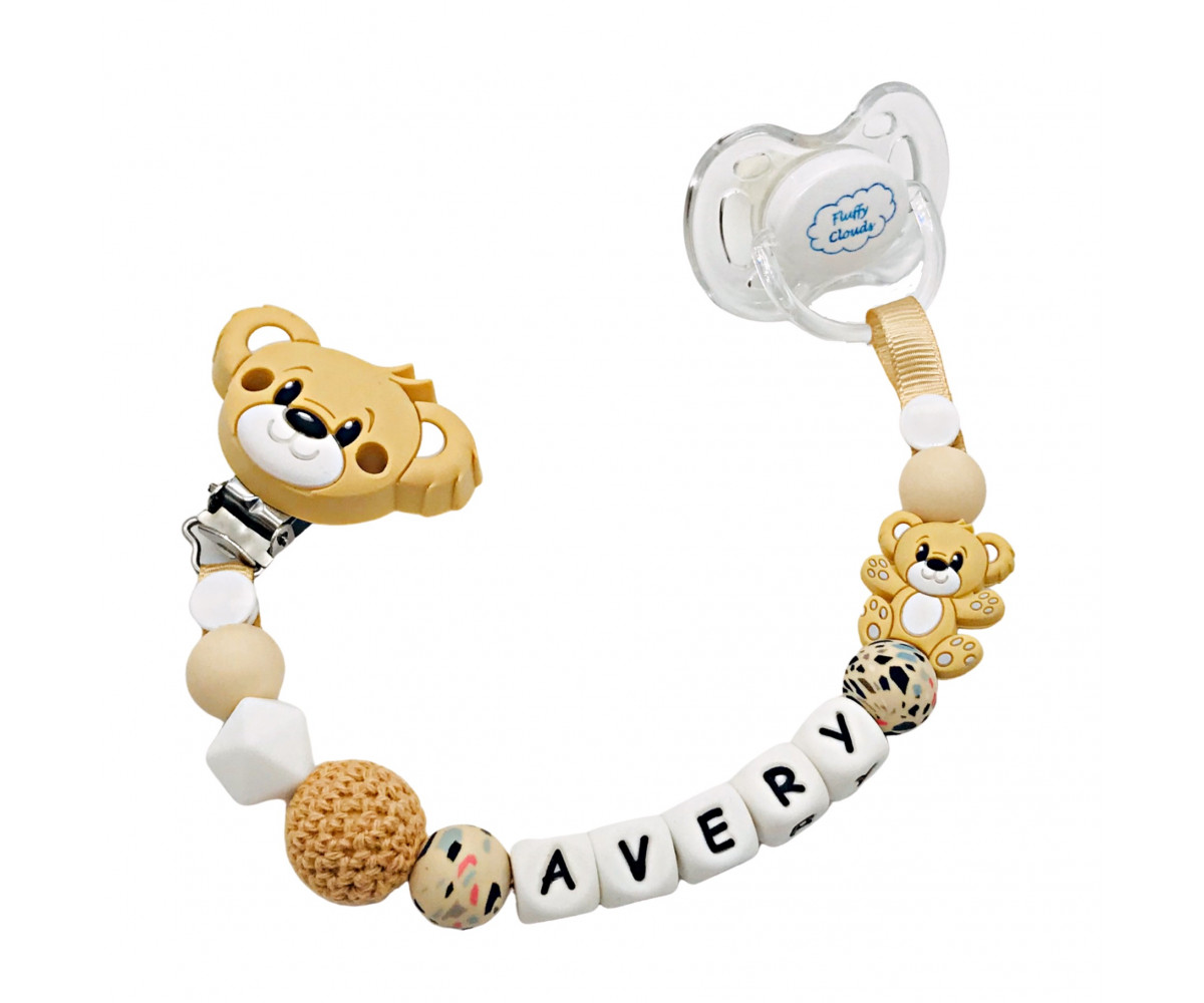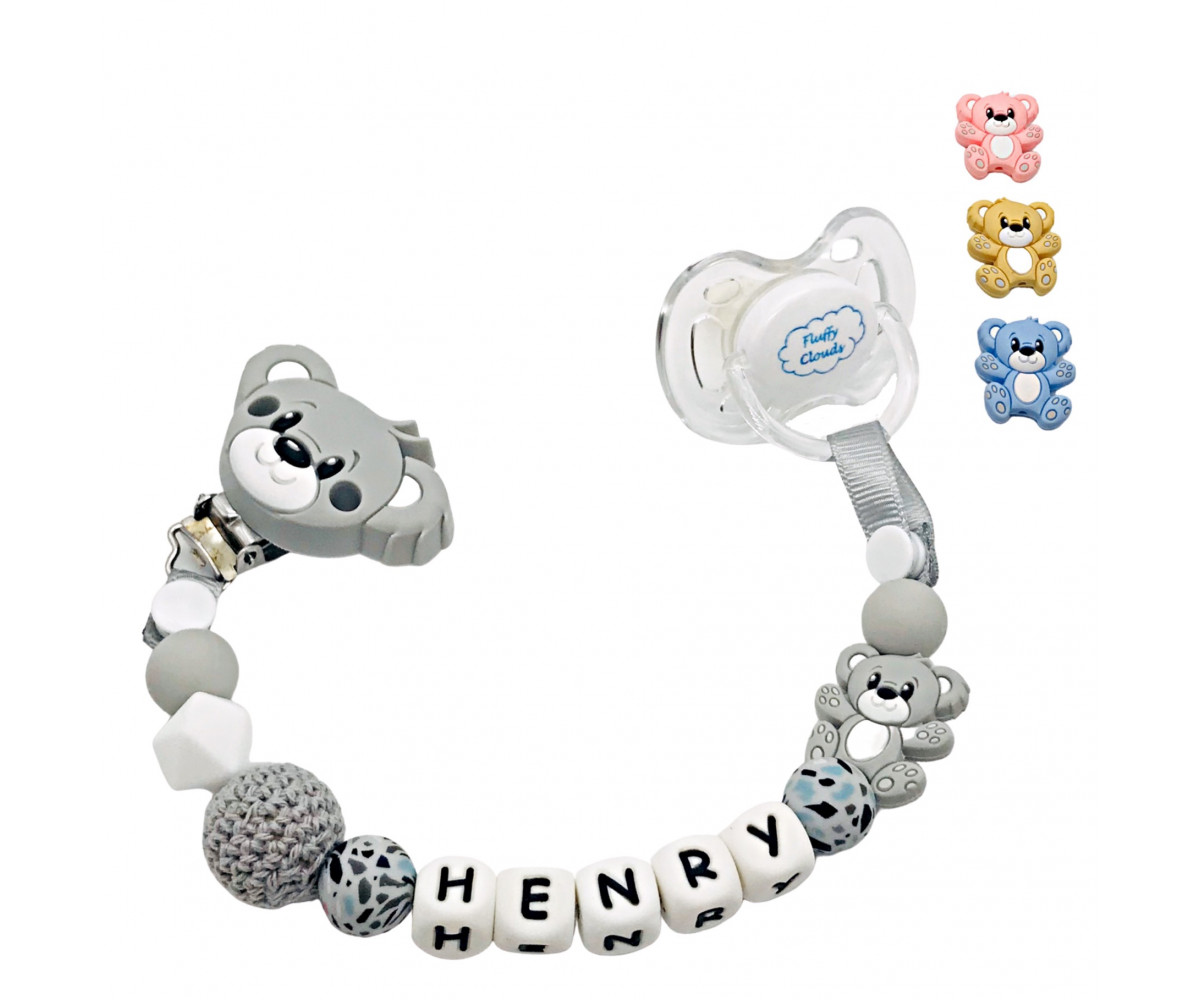 FLUFFY CLOUDS Terra Bear Pacifier Clip is a practical accessory for parents and babies. Modern stylish designs that are easy to use and fun to chew on! A safe and hygienic way to prevent the dummy from getting lost or dirty. Our pacifier clips come in a variety of colours, shapes and interesting textures. Carefully handmade in the UK. Suitable from birth.