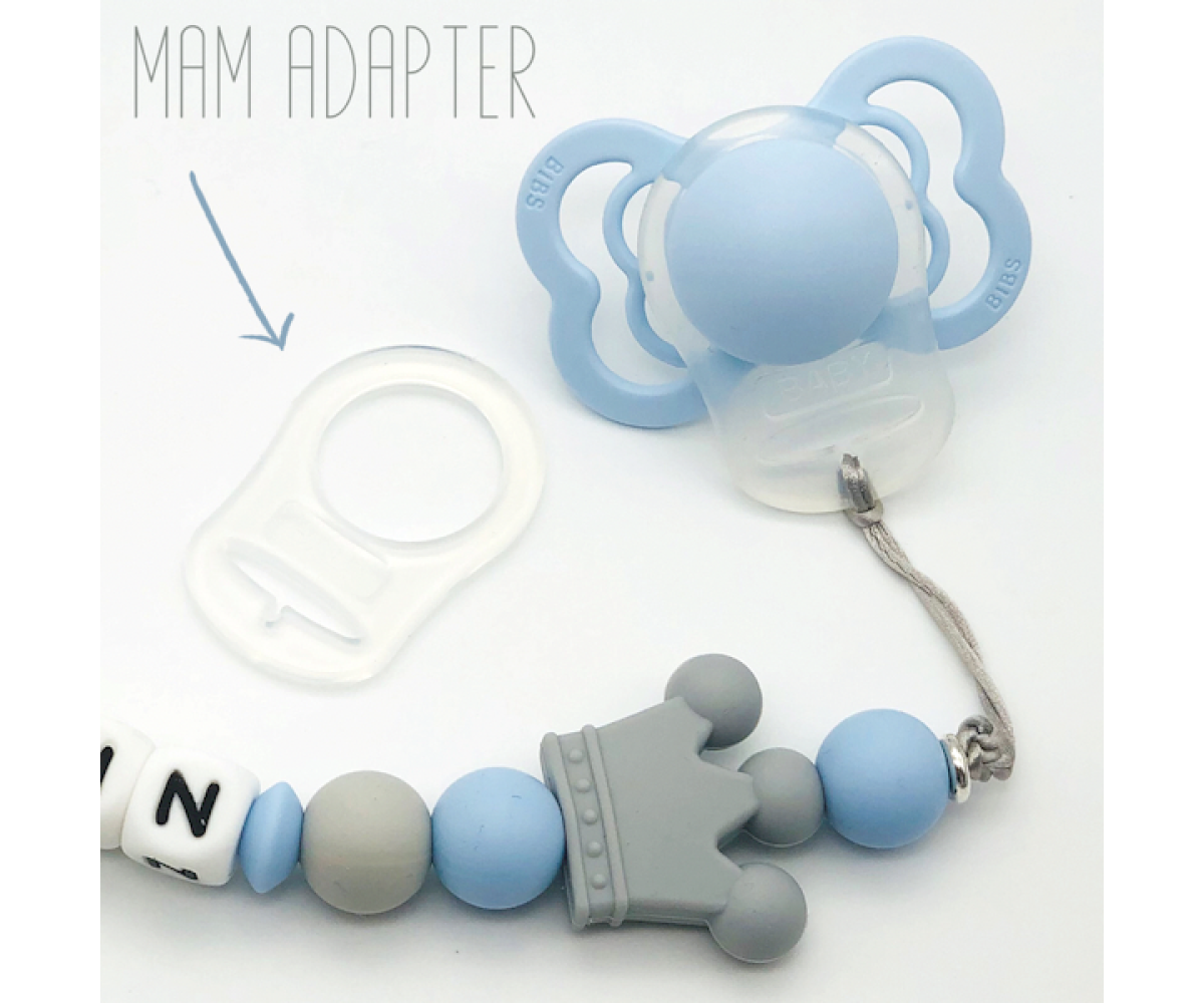 If you are using MAM or NUK dummies (with no handle on, just a button in the middle) you will need a MAM adapter to attach your dummy to the pacifier clip. We are selling the Mam adapter separately.