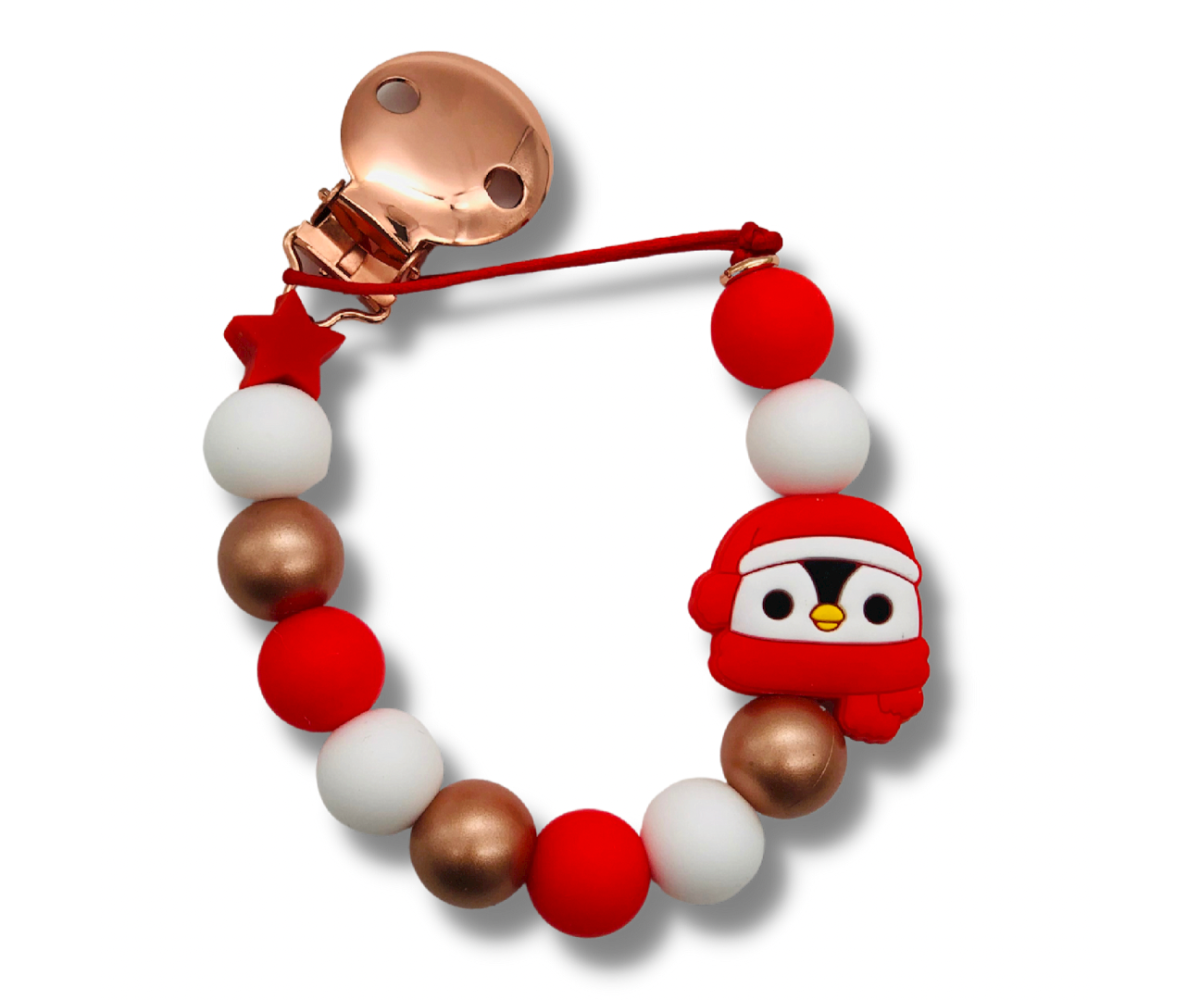 FLUFFY CLOUDS Xmas Penguin Pacifier Clip is a practical accessory for parents and babies. Modern stylish designs that are easy to use and fun to chew on! A safe and hygienic way to prevent the dummy from getting lost or dirty. Our pacifier clips come in a variety of colours, shapes and interesting textures. Carefully handmade in the UK. Suitable from birth.