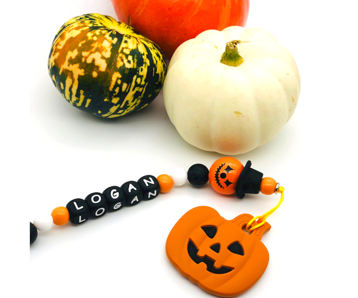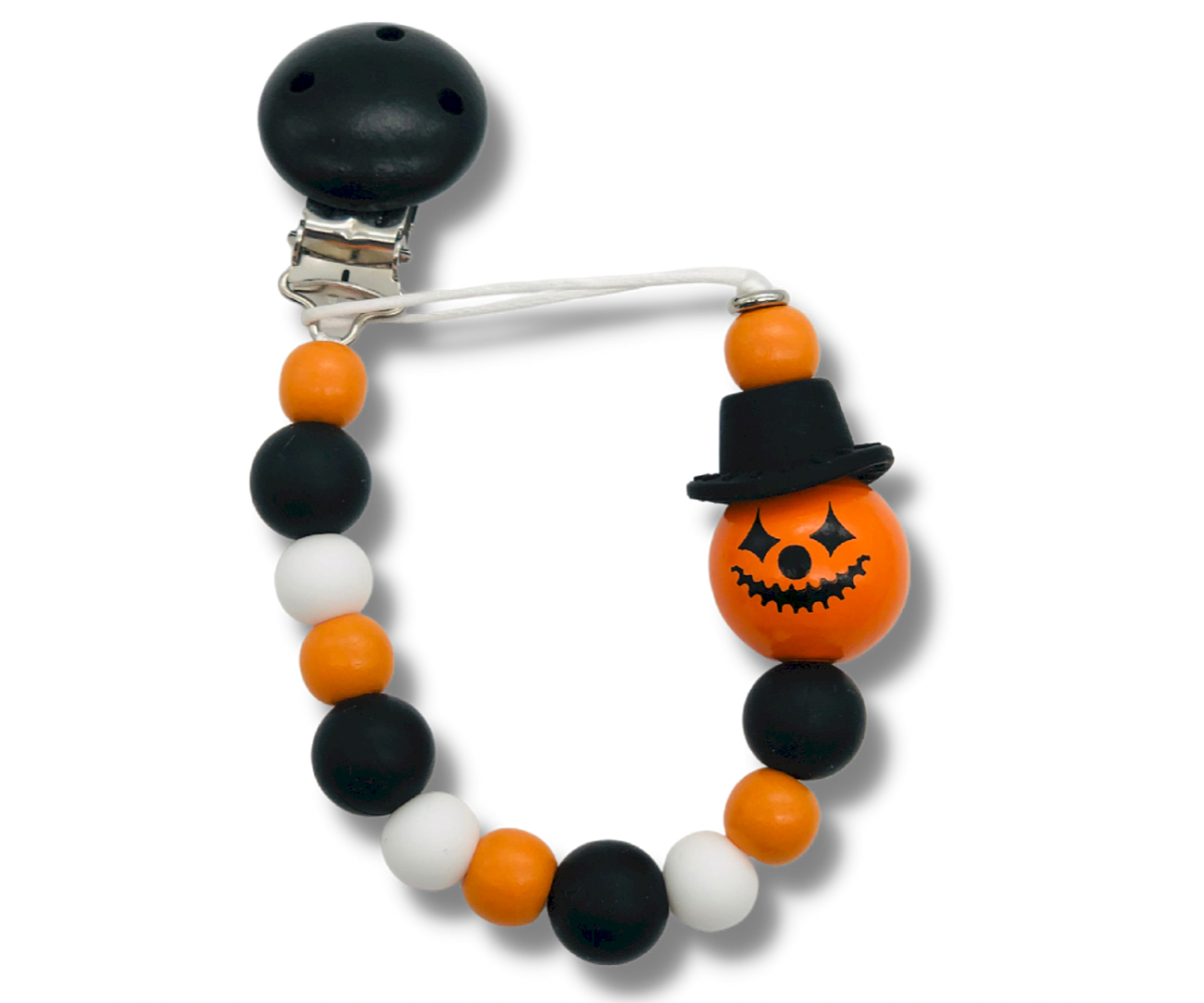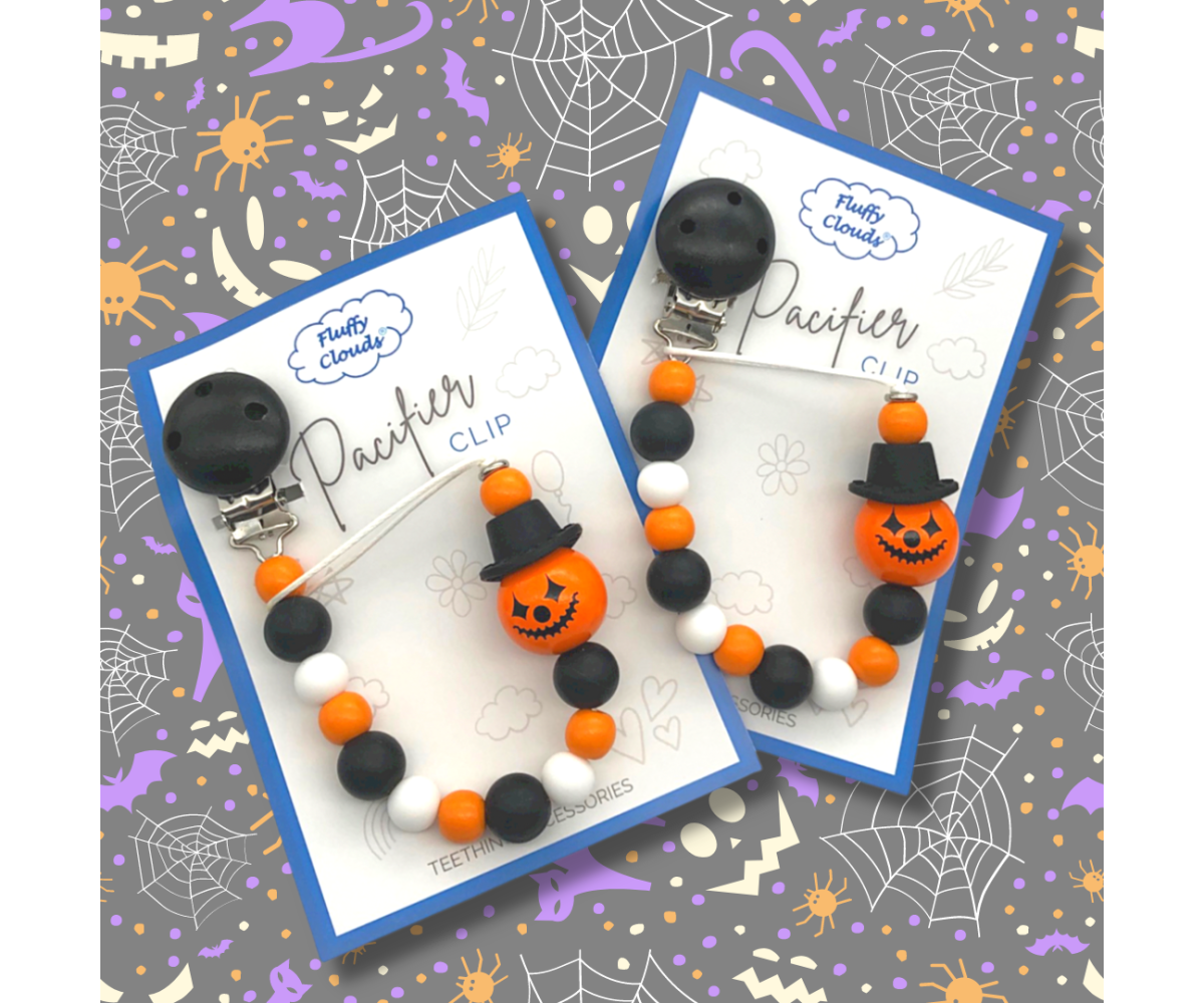 FLUFFY CLOUDS Halloween Jack O' Lantern Pacifier Clip is a practical accessory for parents and babies. Modern stylish designs that are easy to use and fun to chew on! A safe and hygienic way to prevent the dummy from getting lost or dirty. Our pacifier clips come in a variety of colours, shapes and interesting textures. Carefully handmade in the UK. Suitable from birth.
