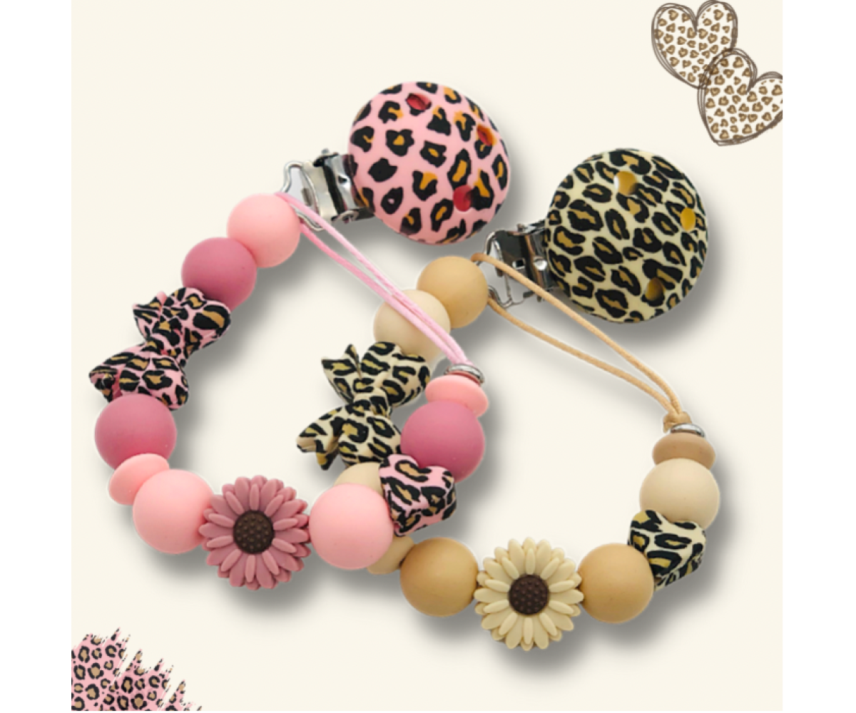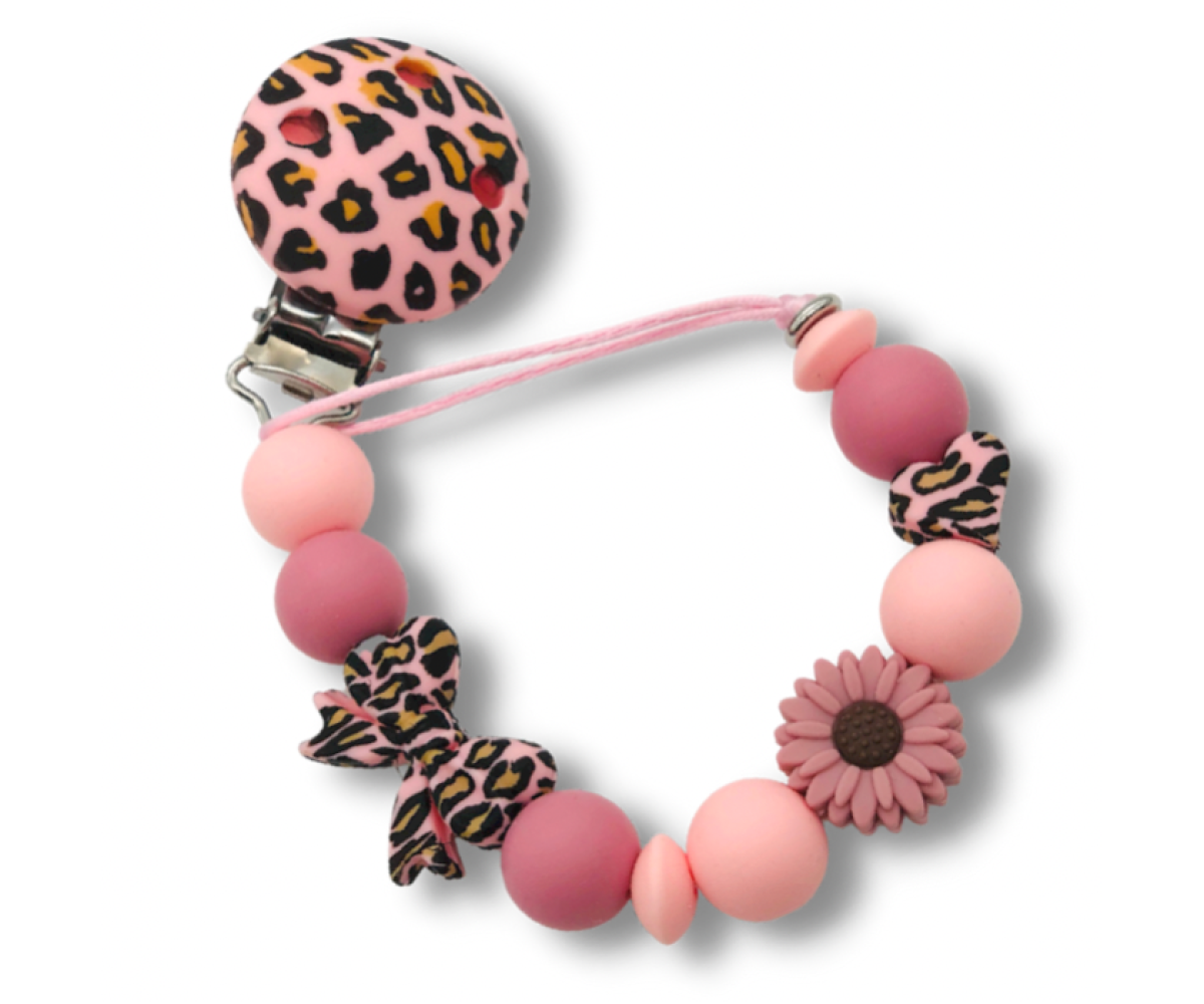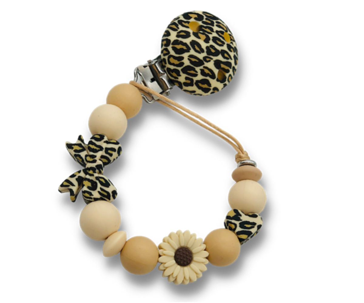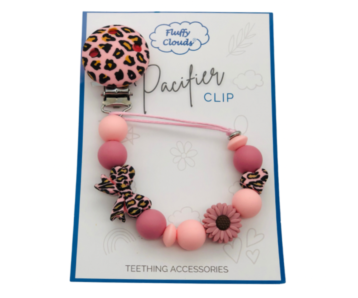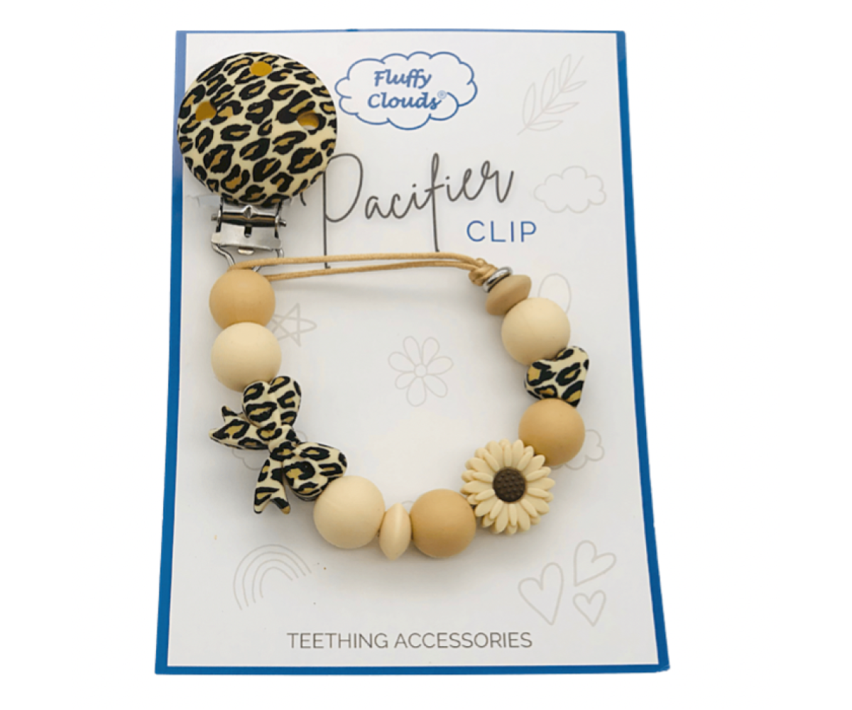 FLUFFY CLOUDS Leopard Flower Pacifier Clip is a practical accessory for parents and babies. Modern stylish designs that are easy to use and fun to chew on! A safe and hygienic way to prevent the dummy from getting lost or dirty. Our pacifier clips come in a variety of colours, shapes and interesting textures. Carefully handmade in the UK. Suitable from birth.