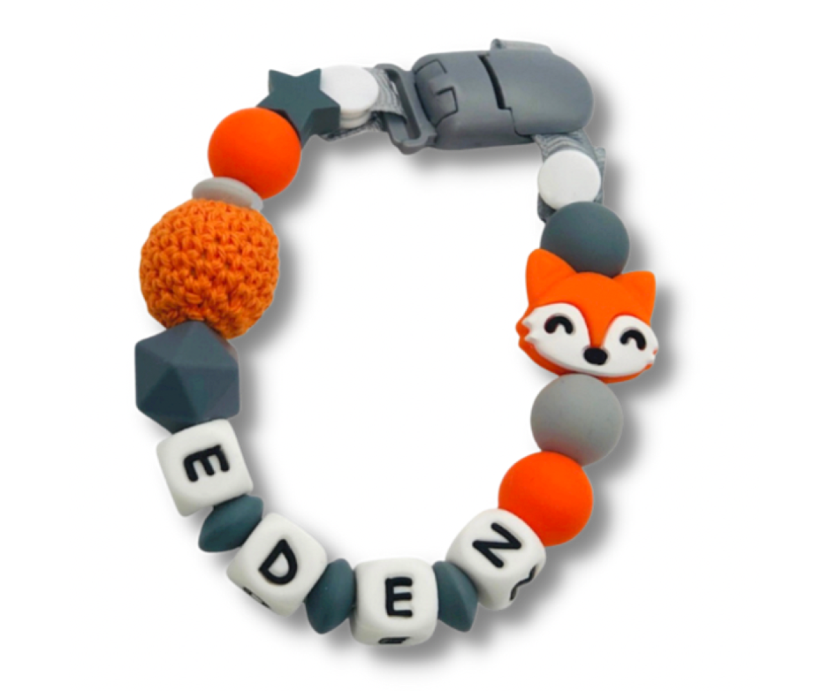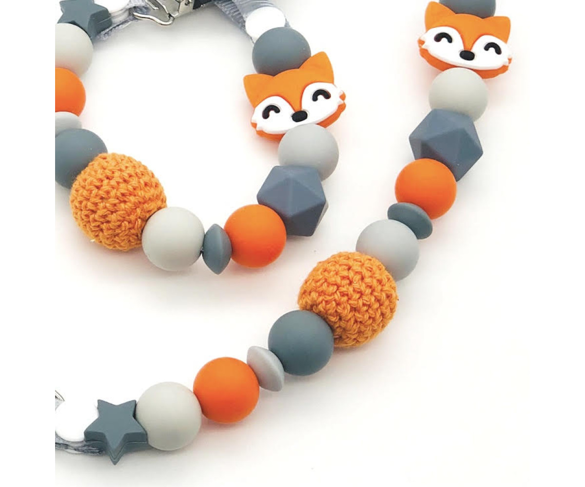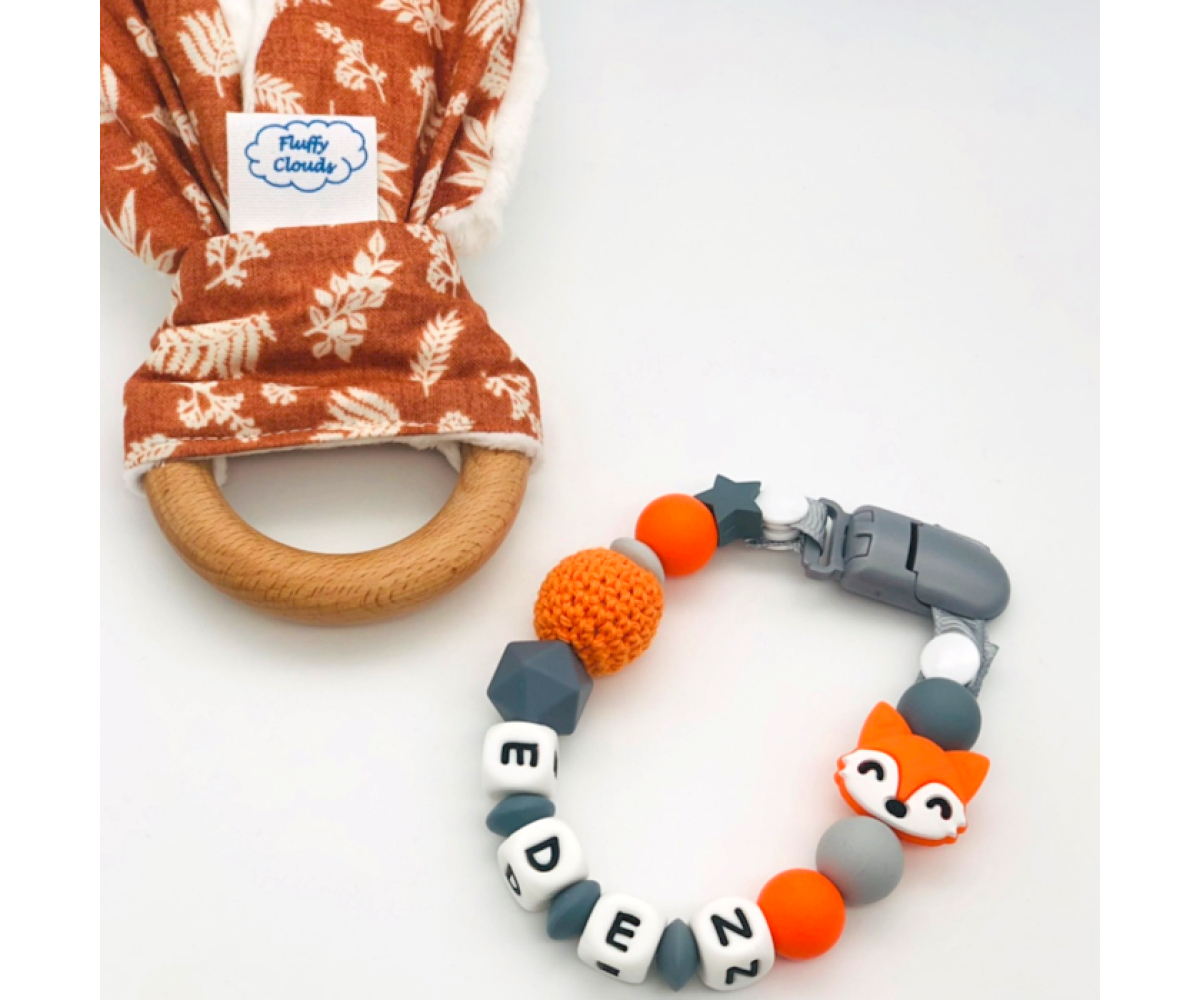 FLUFFY CLOUDS Fox Orange Pacifier Clip is a practical accessory for parents and babies. Modern stylish designs that are easy to use and fun to chew on! A safe and hygienic way to prevent the dummy from getting lost or dirty. Our pacifier clips come in a variety of colours, shapes and interesting textures. Carefully handmade in the UK. Suitable from birth.