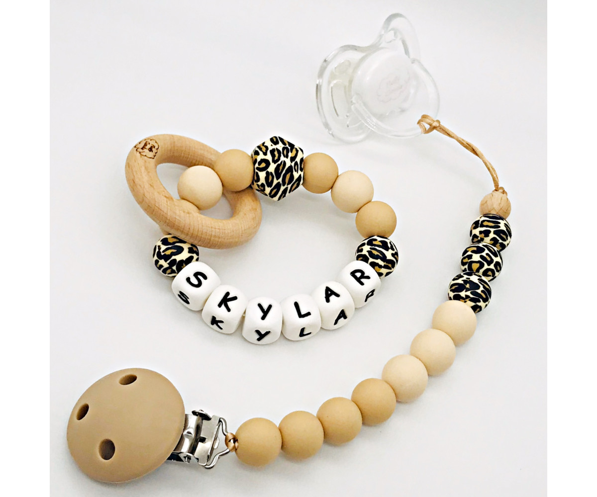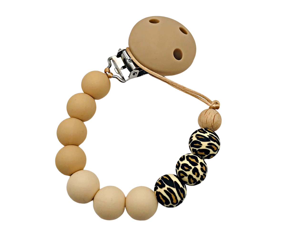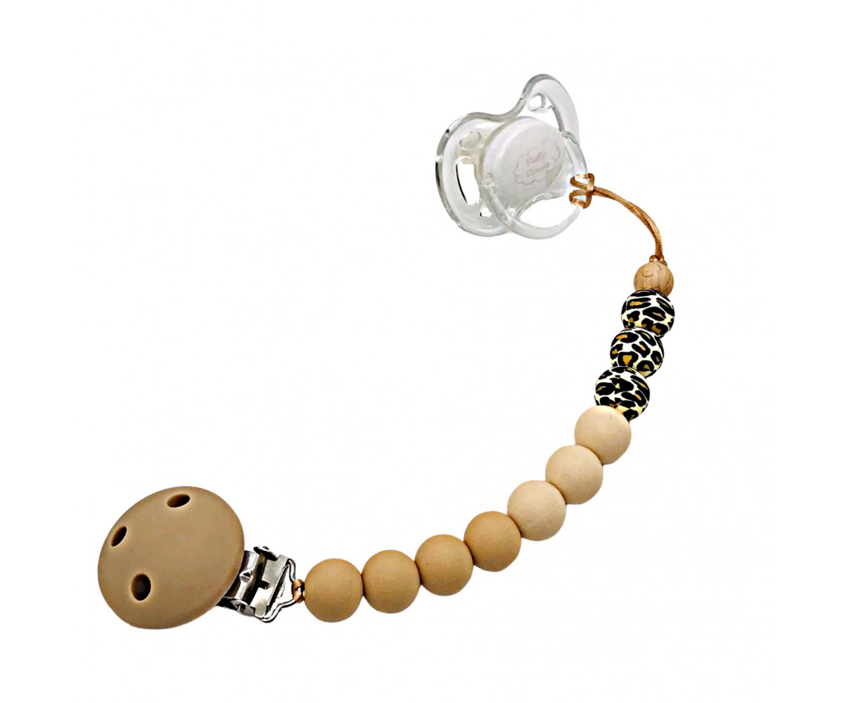 FLUFFY CLOUDS Leopard Print Pacifier Clip is a practical accessory for parents and babies. Modern stylish designs that are easy to use and fun to chew on! A safe and hygienic way to prevent the dummy from getting lost or dirty. Our pacifier clips come in a variety of colours, shapes and interesting textures. Carefully handmade in the UK. Suitable from birth.
