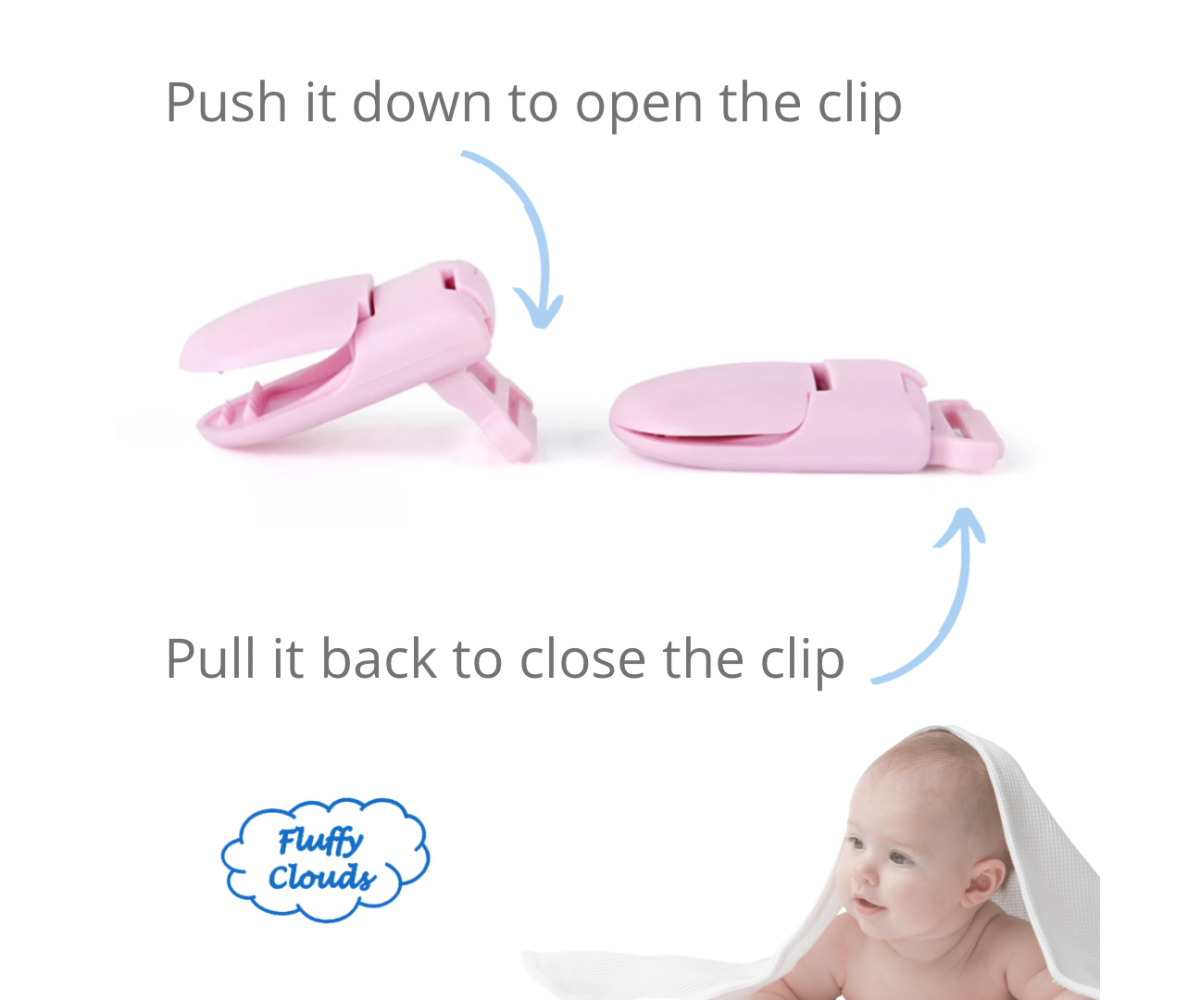 Pacifier Clip is not a toy, parental supervision constantly required! Before each use, check the entire pacifier clip. Dispose of at the first sign of weakness or damage. The dummy must be attached to the pacifier clip before use. Do not use when the baby is in a cot, bed or crib unsupervised. Do not attach it to a cord, ribbons, laces or loose parts of clothing, that could cause a choking hazard. Never lengthen the Pacifier Clip. Recommend replacing after 3 months of continued use.