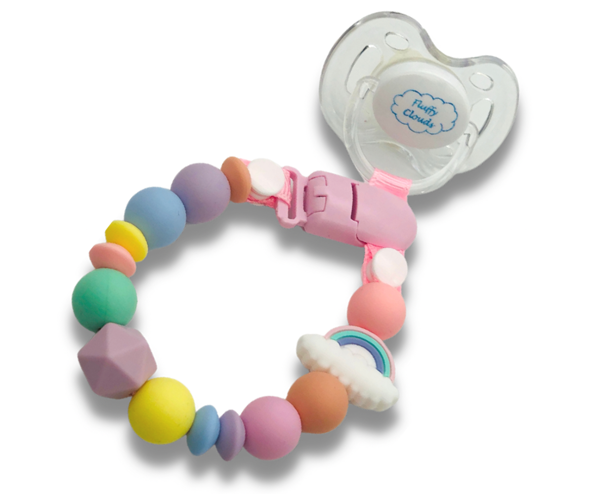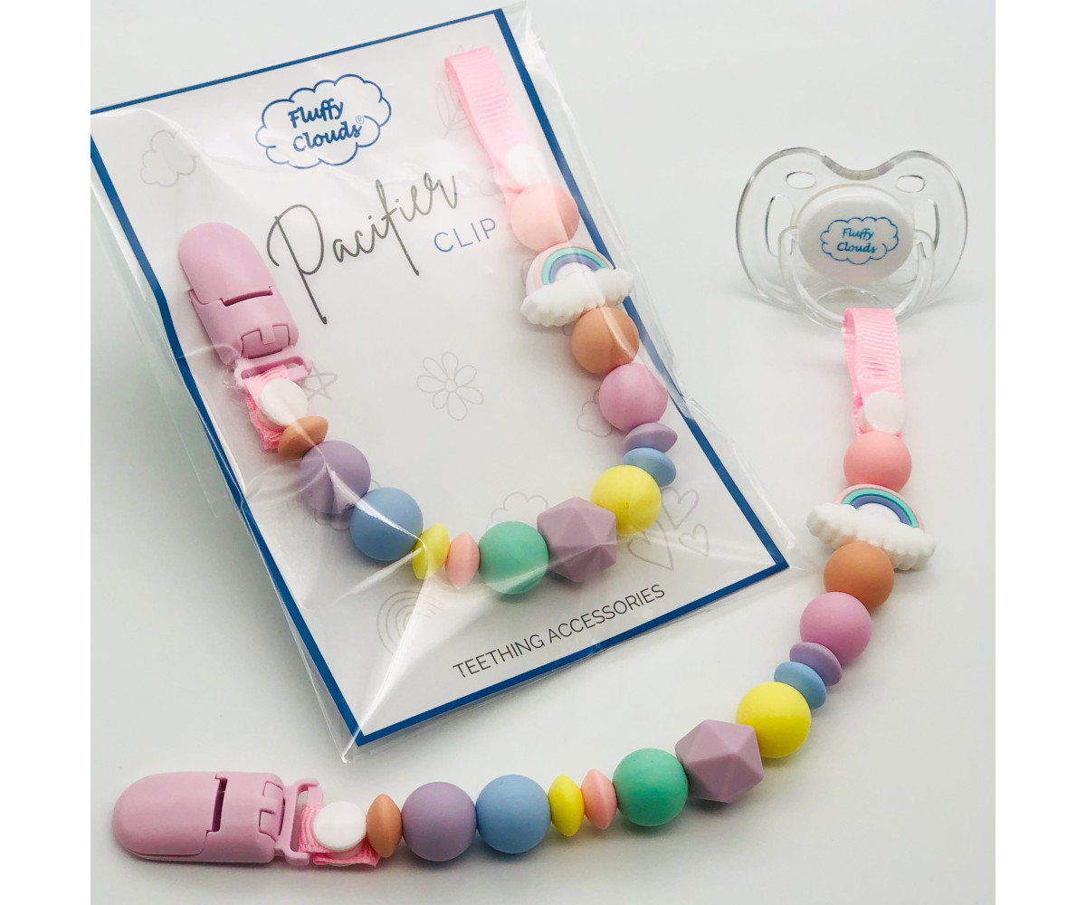 FLUFFY CLOUDS Pastel Pacifier Clip is a practical accessory for parents and babies. Modern stylish designs that are easy to use and fun to chew on! A safe and hygienic way to prevent the dummy from getting lost or dirty. Our pacifier clips come in a variety of colours, shapes and interesting textures. Carefully handmade in the UK. Suitable from birth.