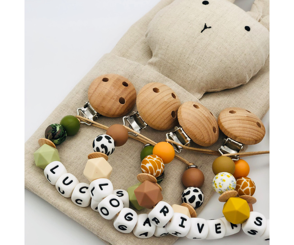 Tags: dummy clip, pacifier holder, soother chain, handmade, personalized, silicone chewable beads, baby name, baby shower gift, new born present, teething accessories