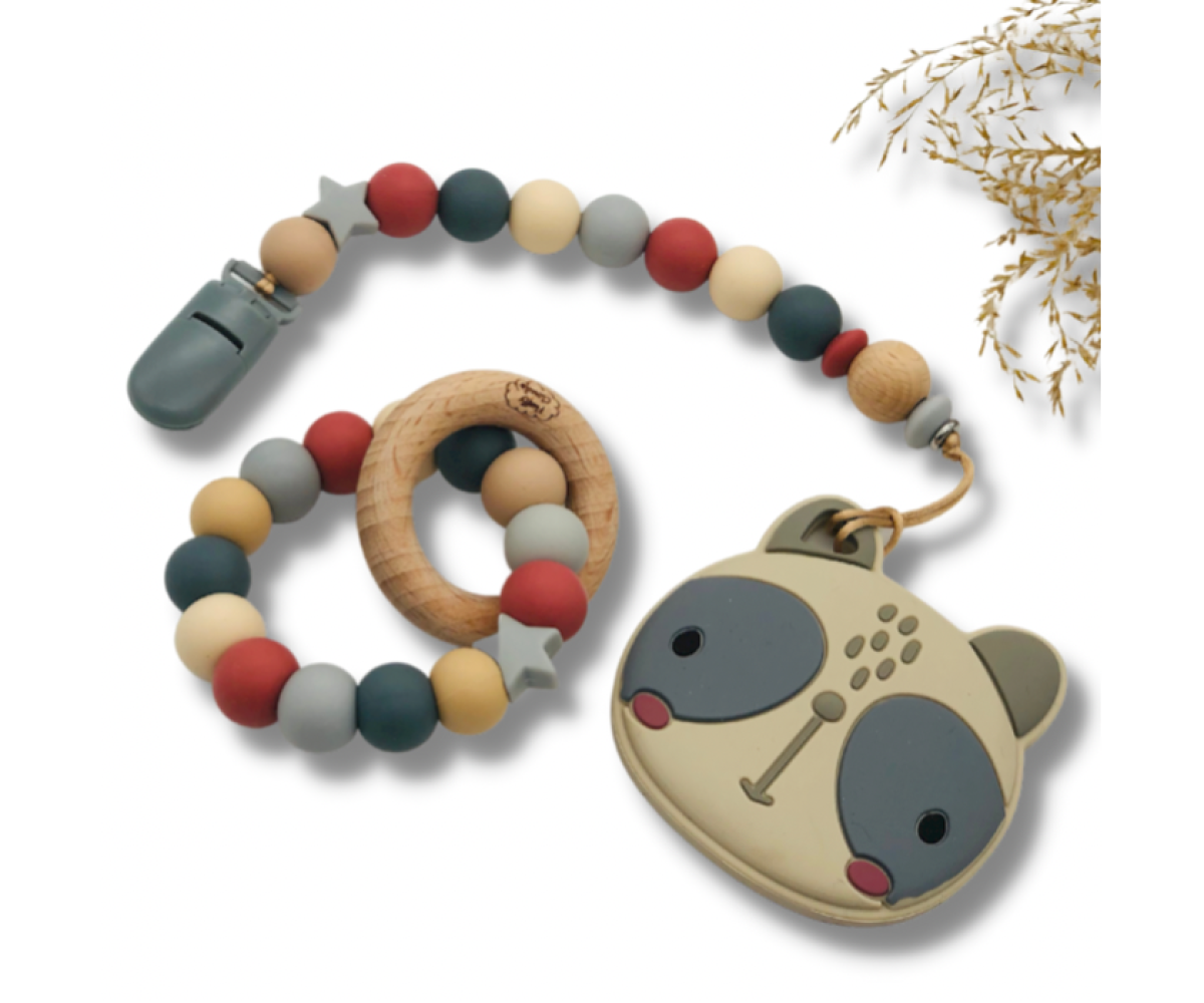 Raccoon teether toy is practical for teething baby. Easy for little hands to grab and the soft silicone toy is safe to chew on. Helps to soothe sore little gums. Colorful designs and playful characters that your baby will easily engage with.