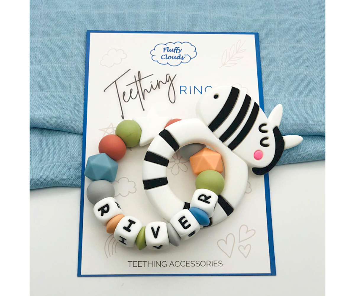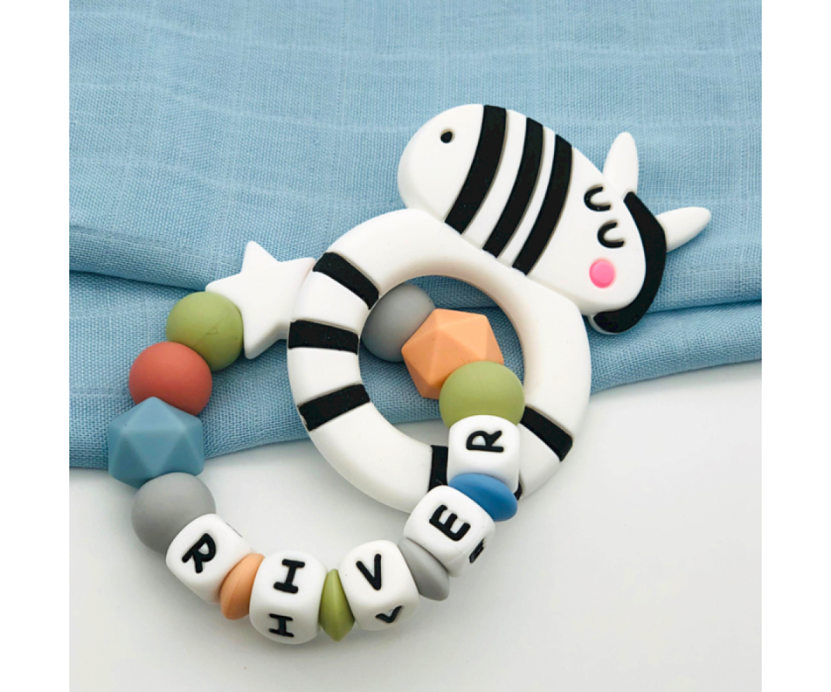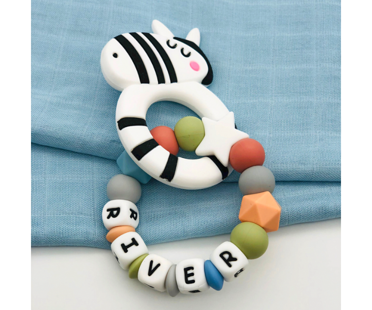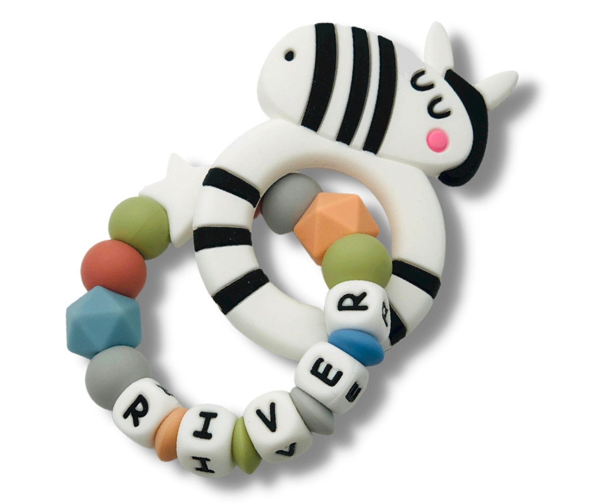 Super sweet zebra silicone teething ring with the little ones name on is the perfect solution to chew on! Relief for those little gums while the playful designs and gentle rattling sounds will keep them occupied all day!