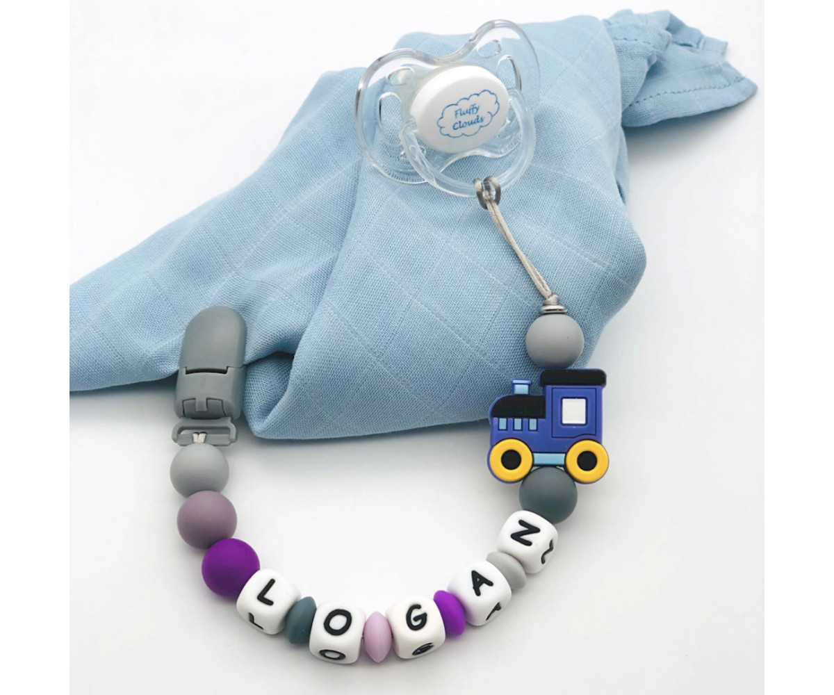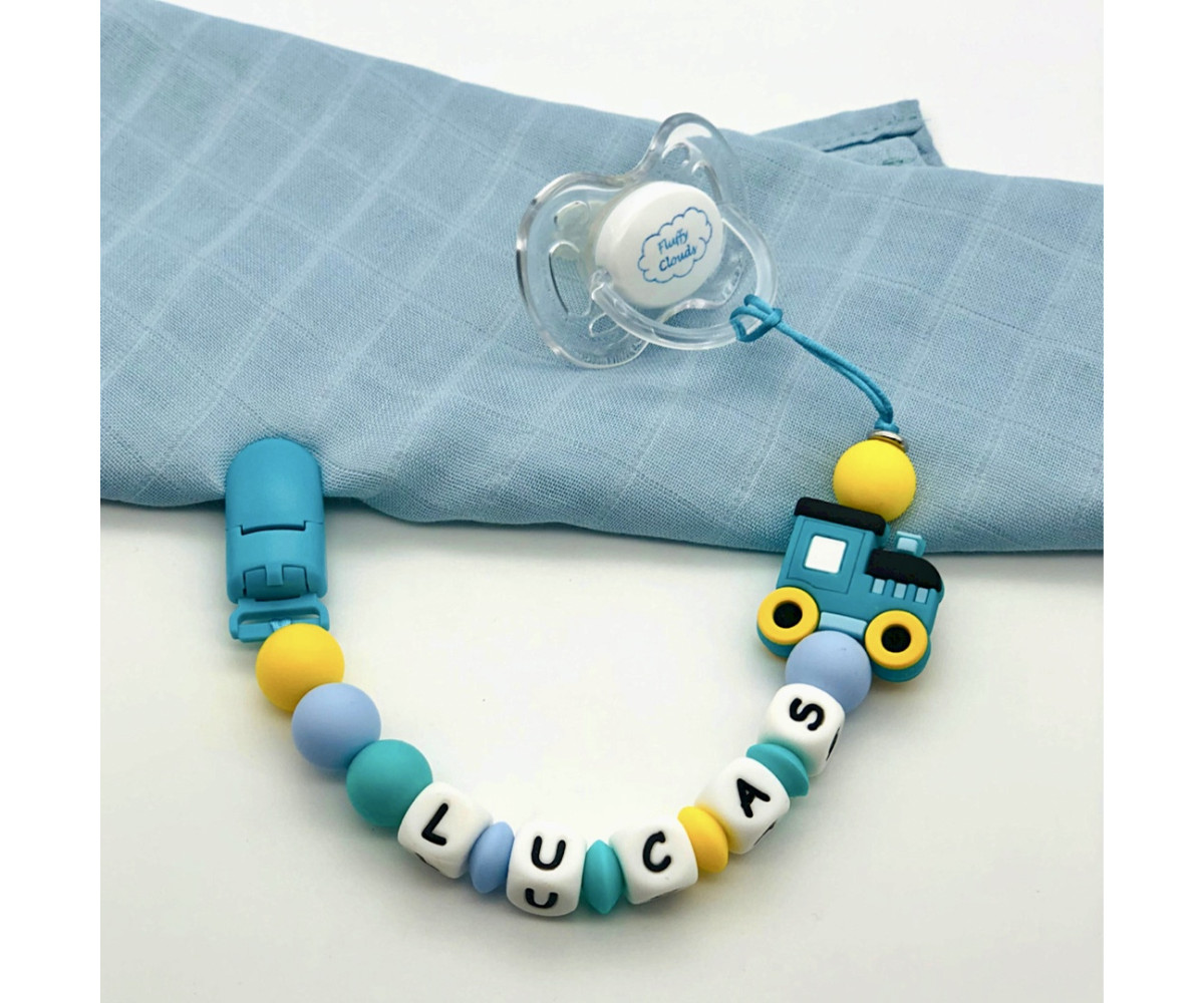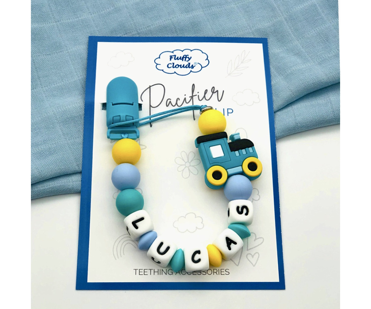 FLUFFY CLOUDS Train Pacifier Clip is a practical accessory for parents and babies. Modern stylish designs that are easy to use and fun to chew on! A safe and hygienic way to prevent the dummy from getting lost or dirty. Our pacifier clips come in a variety of colours, shapes and interesting textures. Carefully handmade in the UK. Suitable from birth.
