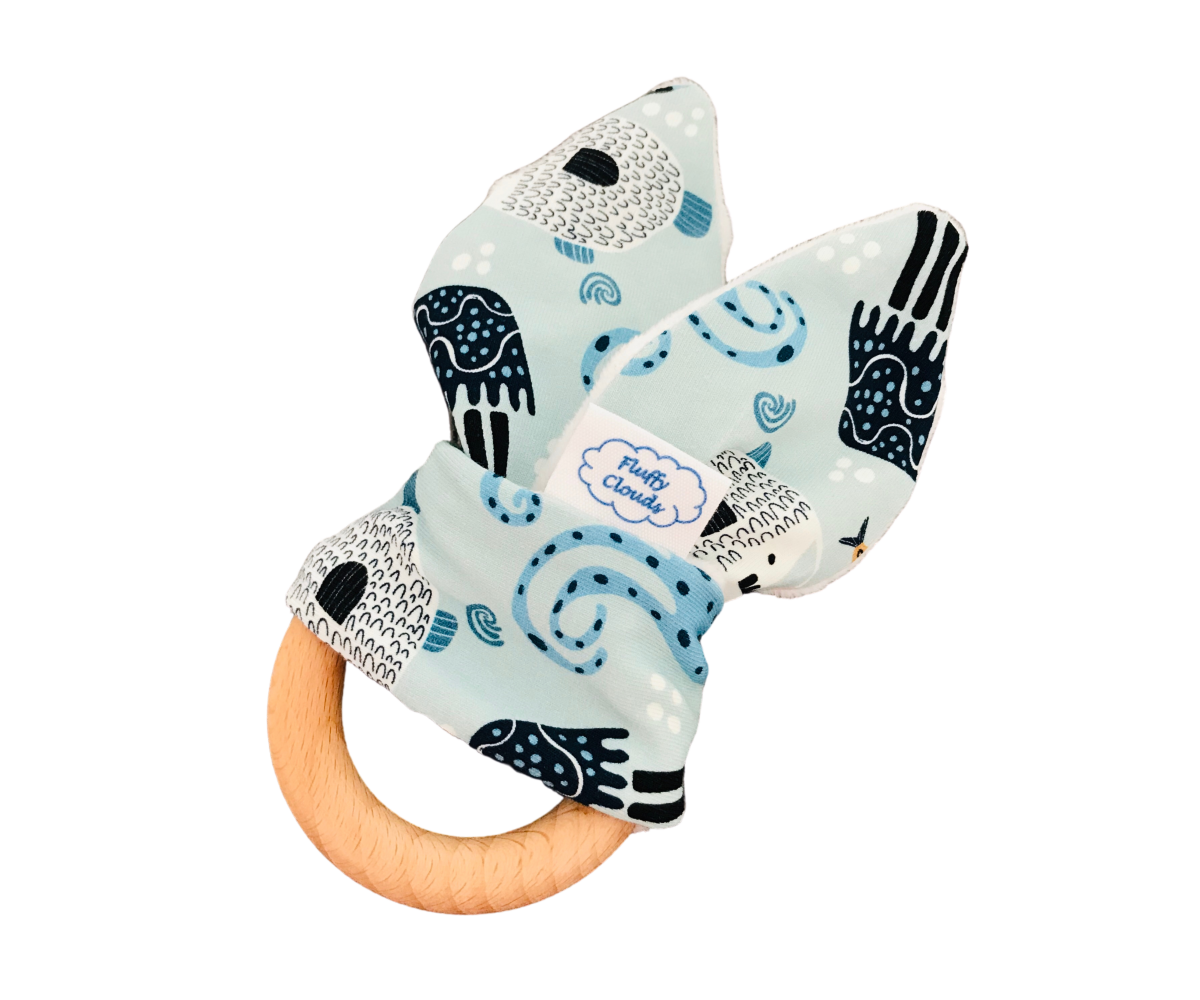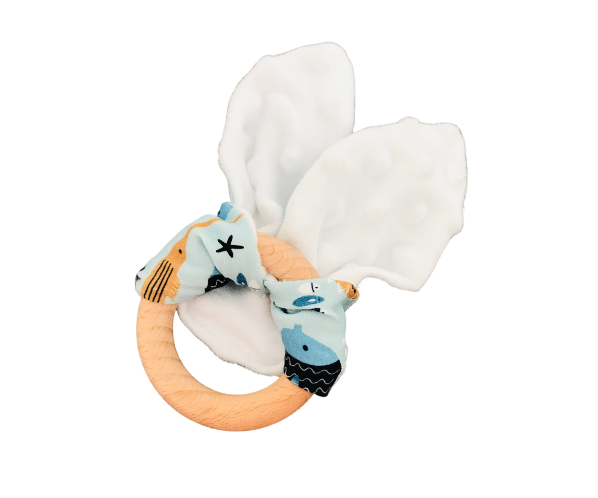The playful Bunny Ears Teething Ring with colourful sea world designed cotton printed fabric is a real joy for babies. Exciting patterns, high quality fabric which is smooth to touch with a safe and hygienic antibacterial beech wooden ring for sore gums to chew on