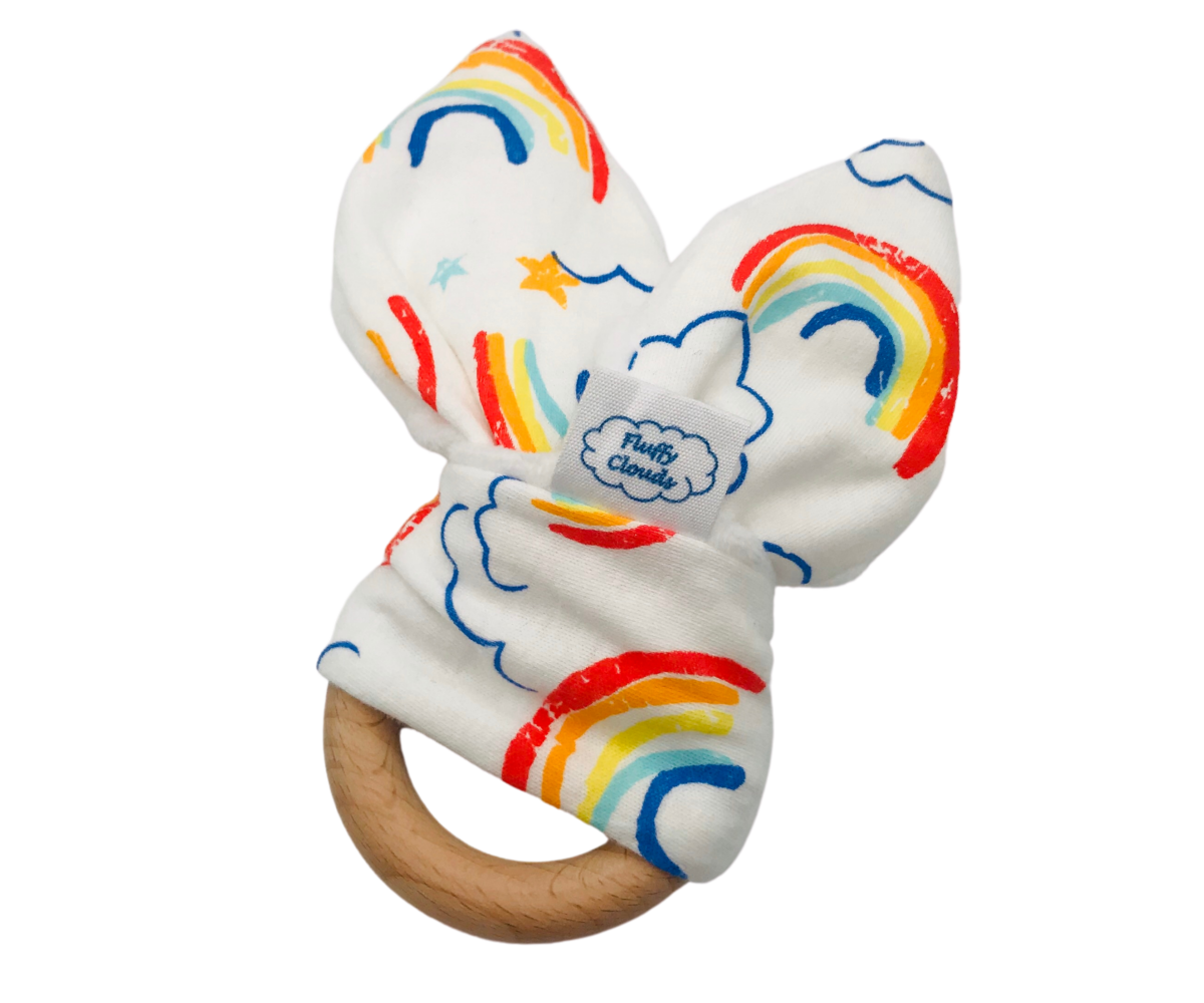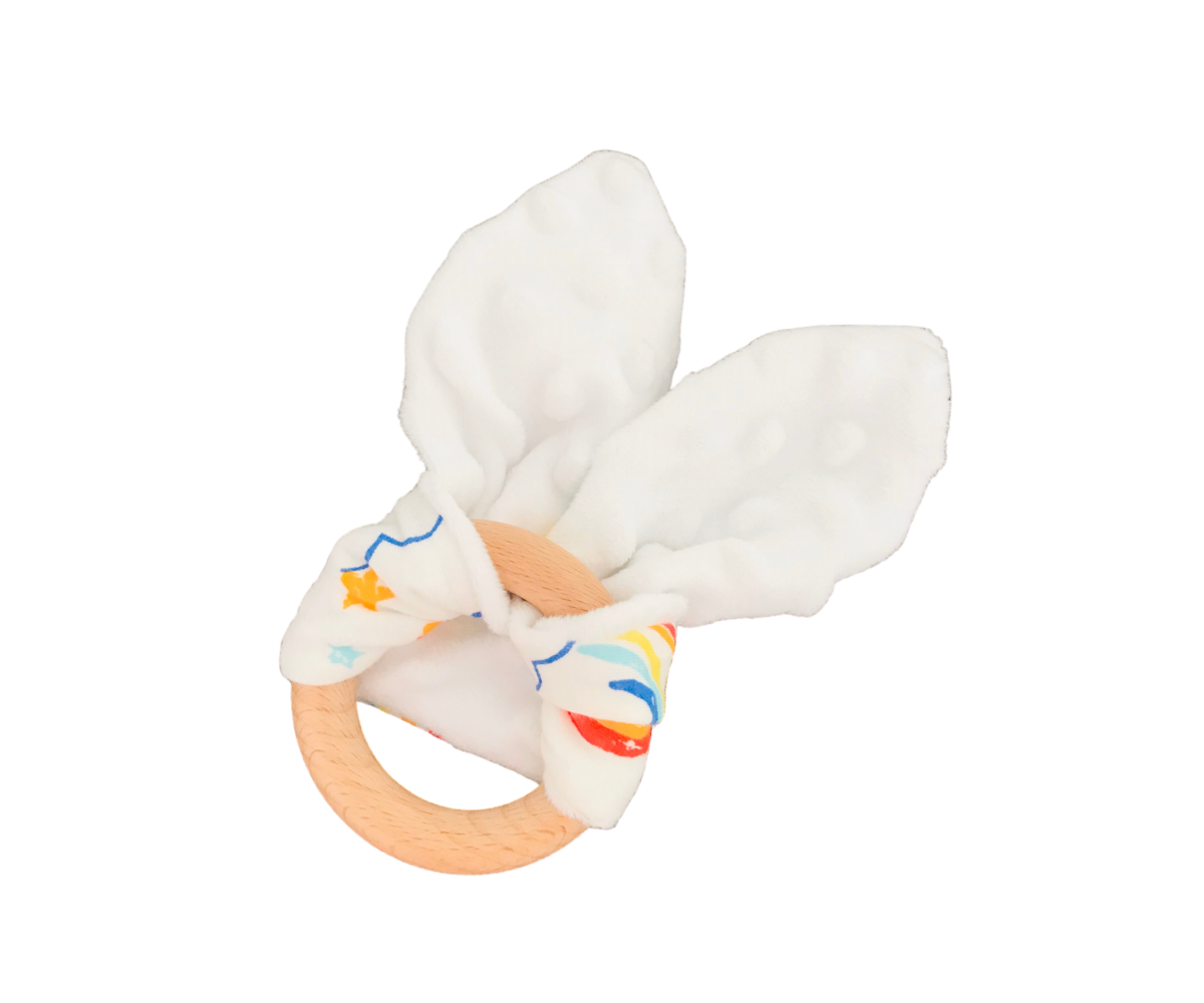 The playful Bunny Ears Teething Ring with colourful rainbow cotton printed fabric is a real joy for babies. Exciting patterns, high quality fabric which is smooth to touch with a safe and hygienic antibacterial beech wooden ring for sore gums to chew on.