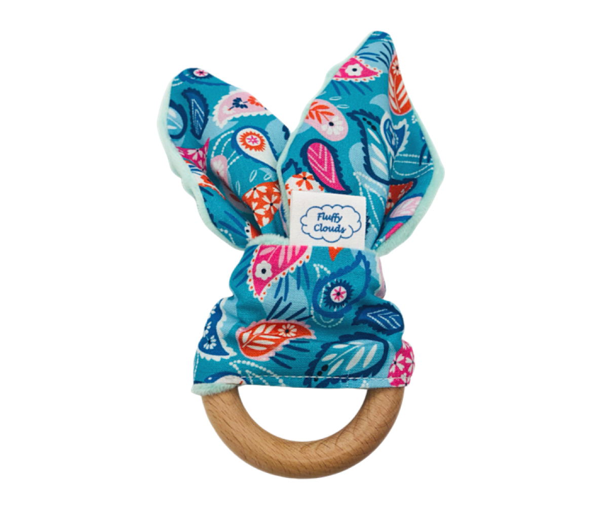 The playful Bunny Ears Teething Ring with colourful cotton printed fabric is a real joy for babies. Exciting patterns, high quality fabric which is smooth to touch with a safe and hygienic antibacterial beech wooden ring for sore gums to chew on.